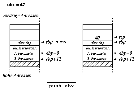 push rax ; f1's second parameter push rbx ; f1's first Parameter call f1 add esp,16 ; Remove parameters from stack ; (the stack grows from high to ; low addresses).