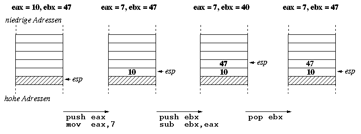 If we temporarily need to store a register's value in main memory, we do not always want to come up with a new label for it. Sometimes we might need that specific register for another computation, but will use its current value at a later point in time for example. In that case we would like to have something similar to a scratch pad. That is exactly what a stack is used for. Actually, the stack is just a piece of main memory, but instead of working with addresses we simply push