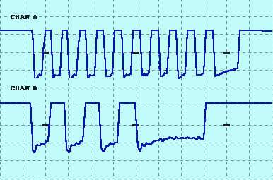 Data and Clock are read on the microcontroller's pins A and B, respectively. Both lines are normally held at +5V, but can be pulled to ground by asserting logic 1