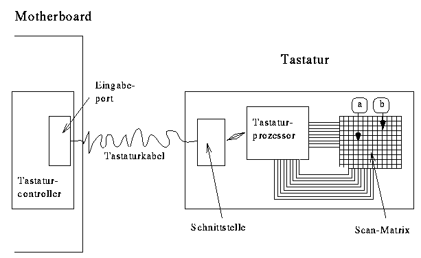 Auf dem Motherboard des PCs befindet sich ein Tastaturcontroller, der auf der einen Seite mit der Tastatur über einen Eingabeport und einen Ausgabeport (Kommandos an die Tastatur) kommuniziert. Auf der anderen Seite hat der Controller Register, die mit Hilfe von in- und out-Befehlen über den Systembus gelesen und beschrieben werden können.