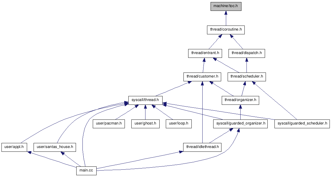 toc_go wird verwendet, um auf jeder CPU den ersten Prozess Ăźberhaupt zu starten. Die Implementierung von toc_go muss in Assembler in der Datei toc.asm erfolgen. Sie muss als extern "C" deklariert werden, da sie als Assemblerfunktion nicht dem C++ Namemangeling unterliegt.